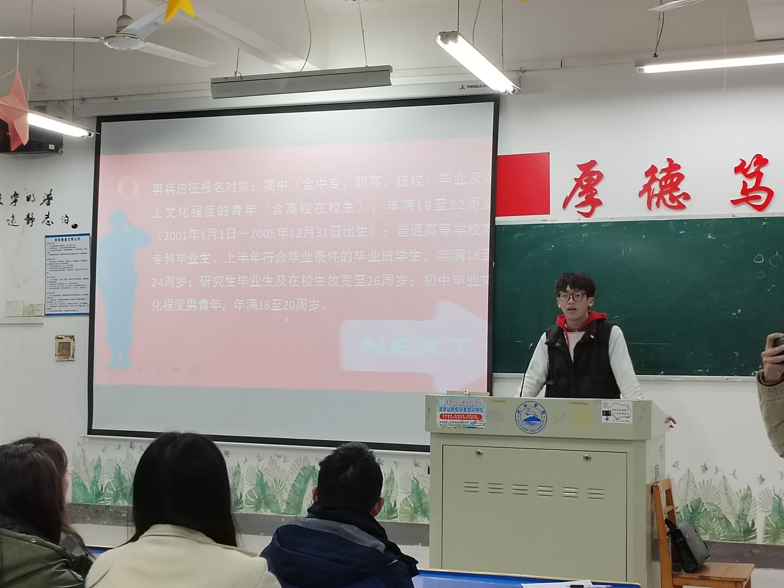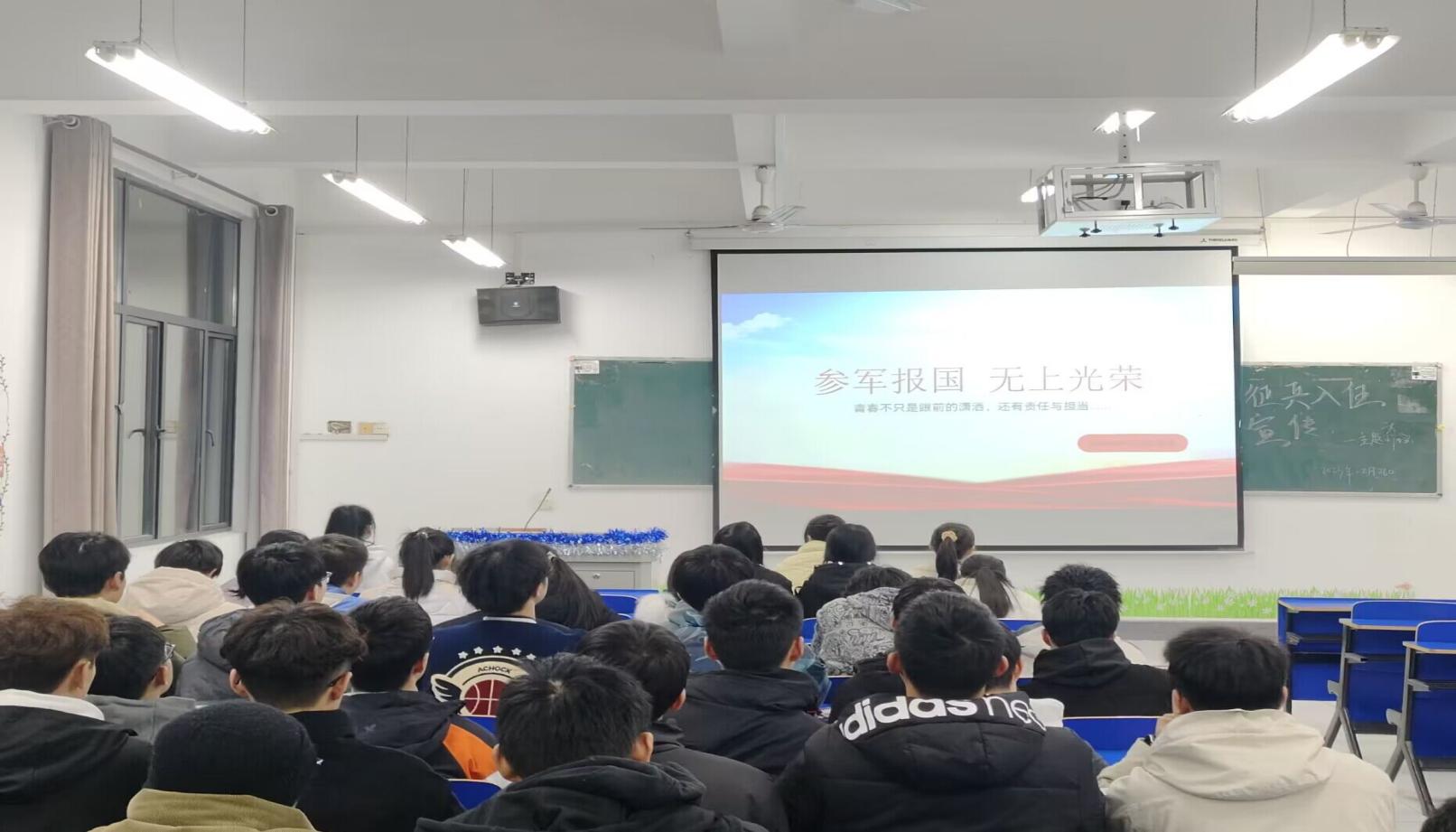 此次班会前各班班干精心准备了ppt和视频,用交叉讲解的形式帮助同学们更深入地了解应征入伍政策及军旅生活、征兵报名工作的具体方式、要求等,鼓励怀揣军旅梦的同学们勇敢地走进军营,实现自己的梦想,进一步激发同学们从军报国、投身国防的热情和决心。