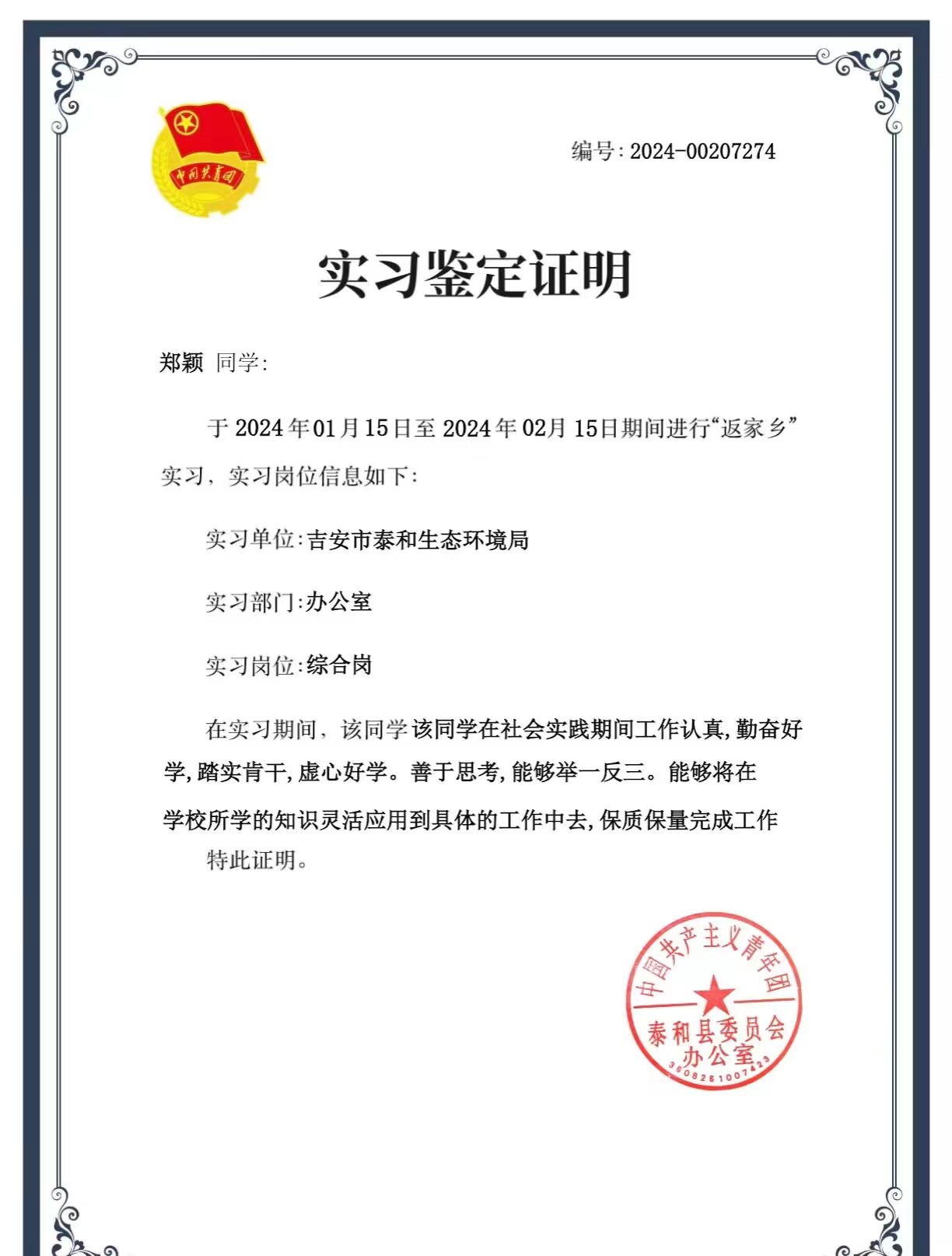 为更好地助力青少年健康快乐成长,寒假期间,团红谷滩区委、九龙湖街道团工委、安丰花园社区团支部组织“青英归巢“返乡大学生志愿者开展”缤纷冬日,快乐成长”寒假小课堂活动。我院志愿者惠琬欣积极响应号召。郑颖同学于吉安市泰和生态环境局实习。在实践中,通过切身体会,加深了对环境监测保护的工作和职责的认知,并对其在国家机关中的重要作用有了深刻理解。通过实习,郑颖同学增长了自己的见识,提升了自己的才能,培养了自己的韧性,受益匪浅。