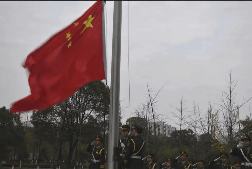 六时四十五分,参加升旗仪式的同学们在升旗台前整齐列队,仪式正式开始。国旗班队员们身姿挺拔俊逸,步伐铿锵有力,护送国旗入场。“升国旗,奏唱国歌!”随着一声号令,升旗手郑重而有力地将国旗抛向天空。伴随着《义勇军进行曲》雄壮的旋律,五星红旗在晨曦中缓缓升起、迎风飘扬,全场肃然静立,深情仰望国旗,齐唱国歌,爱国情怀在每位同学心中升腾。