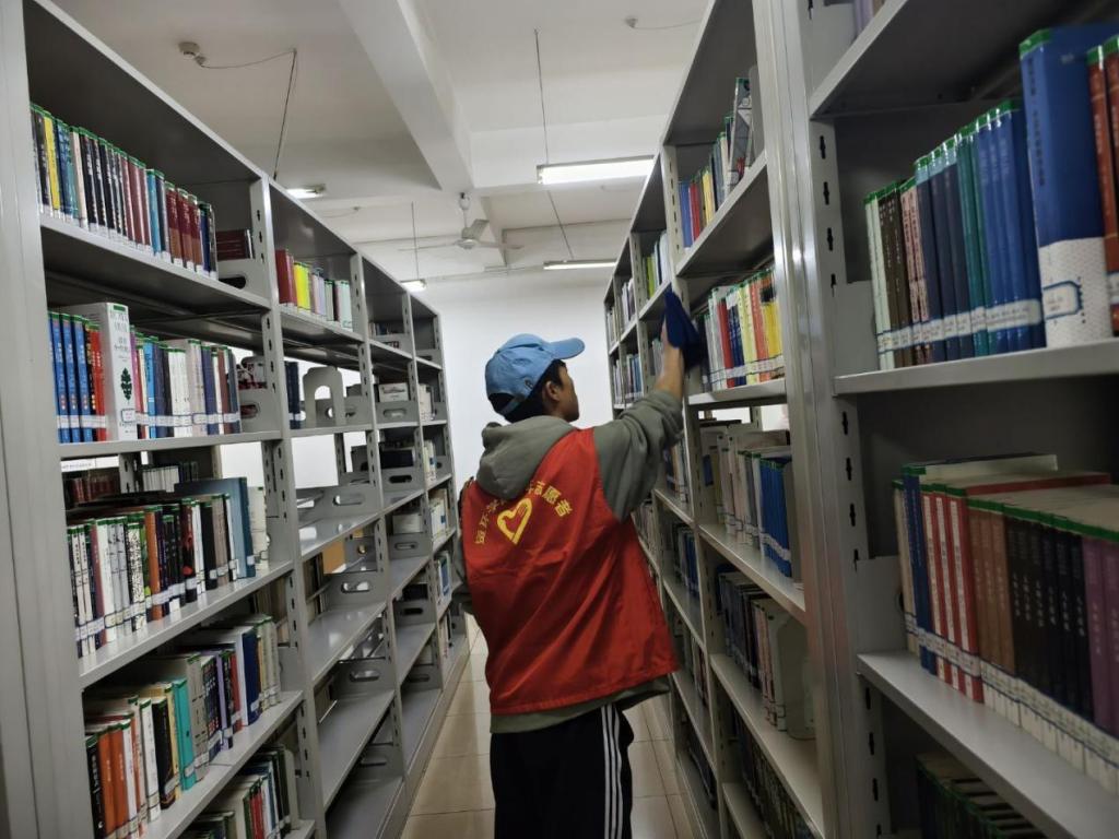 志愿者们在beat365中文官方网站主校区图书馆迅速分工、默契合作。他们手持工具细致清扫地面与书架角落,按分类规范将错位书籍逐本归位。大家以饱满热情投入服务,用行动践行志愿精神,营造出干净有序的阅读环境,为校园传递了温暖的奉献正能量。