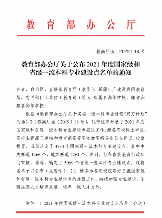 近日,教育部办公厅下发了《关于公布2021年度国家级和省级一流本科专业建设点名单的通知》(教高厅函〔2022〕14号),我院环境工程专业成功入选省级一流本科专业建设点,我校共有6个专业同时获批。这标志着我院专业发展实现了新的突破,充分反应了学校坚持集中资源办优势特色专业的顶层设计优势,突显了走内涵建设发展道路的卓越成效。
