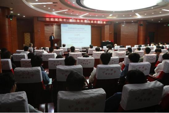 在逸夫图书馆报告厅,江桂斌院士作了题为《新污染物治理与高质量发展》的报告,对新污染物发展态势及我国防治策略进行了深入讲解,介绍了鄱阳湖流域的新污染物案例,并就江西尾矿修复、大中型企业减污降碳等领域内容进行了重点阐述。他说,发展与健康是贯穿人类进化和社会进步的永恒话题,希望同学们能学好专业知识,为中国生态文明建设贡献一份力量。