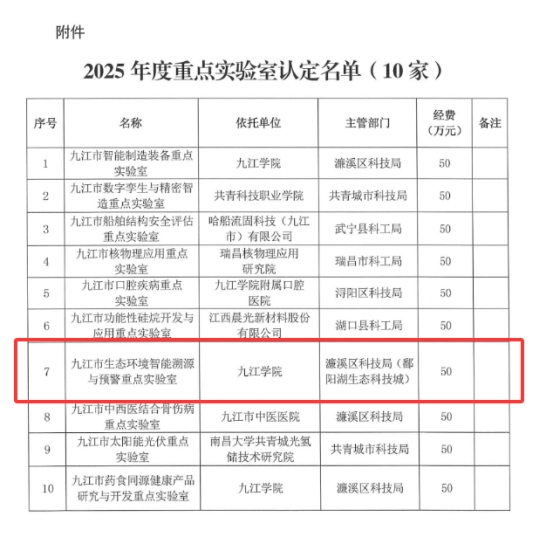 近日,九江市科学技术局公布了2025年度市级科创平台载体认定名单,依托beat365中文官方网站申报的“九江市生态环境智能溯源与预警重点实验室”成功获批。