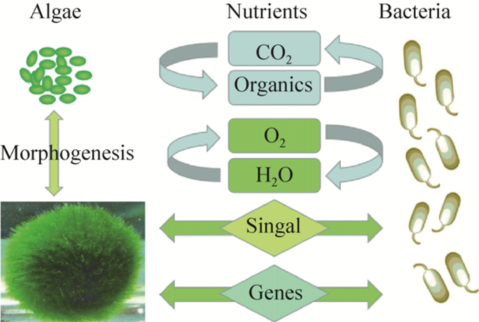 质不是营养物质,而是激活或抑制基因表达和/或生理活动,从而改变它们的行为和生长。在藻类-细菌的相互作用中,细菌分泌化学信号,诱导藻类的形态发生变化。藻类能够分泌特定的化学物质来抑制细菌群体感应。藻际环境中复杂的信号作用,可以利用生物技术来控制藻类和/或细菌。基因转移是相邻的微生物之间基因的水平转移,是一个进化过程。一些水平转移的基因赋予藻类关键的功